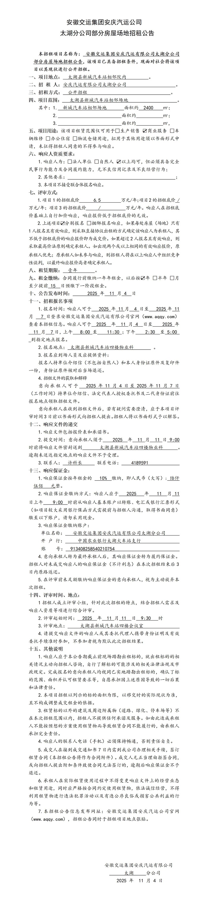 太湖分公司部分房屋場(chǎng)地招租公告